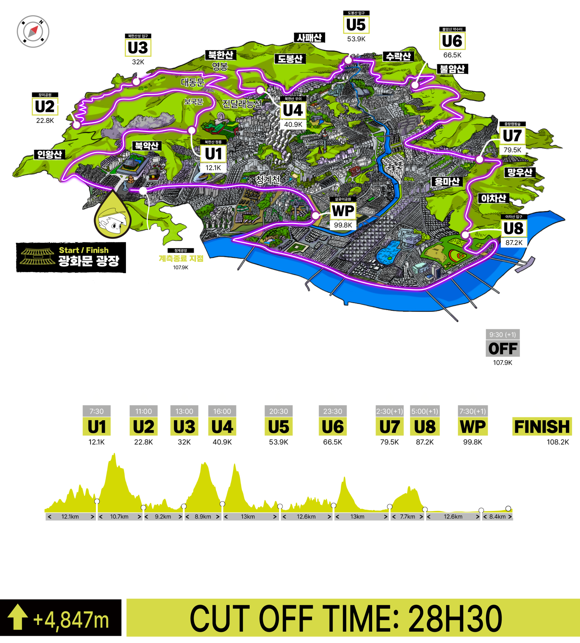 ULTRA TRAIL RUNNING 코스에서 다양한 지형을 통과하며 지구력의 한계에 도전해보세요. 북한산의 높은 봉우리에서부터 한강을 따라 내려가는 이 코스는 아시아에서